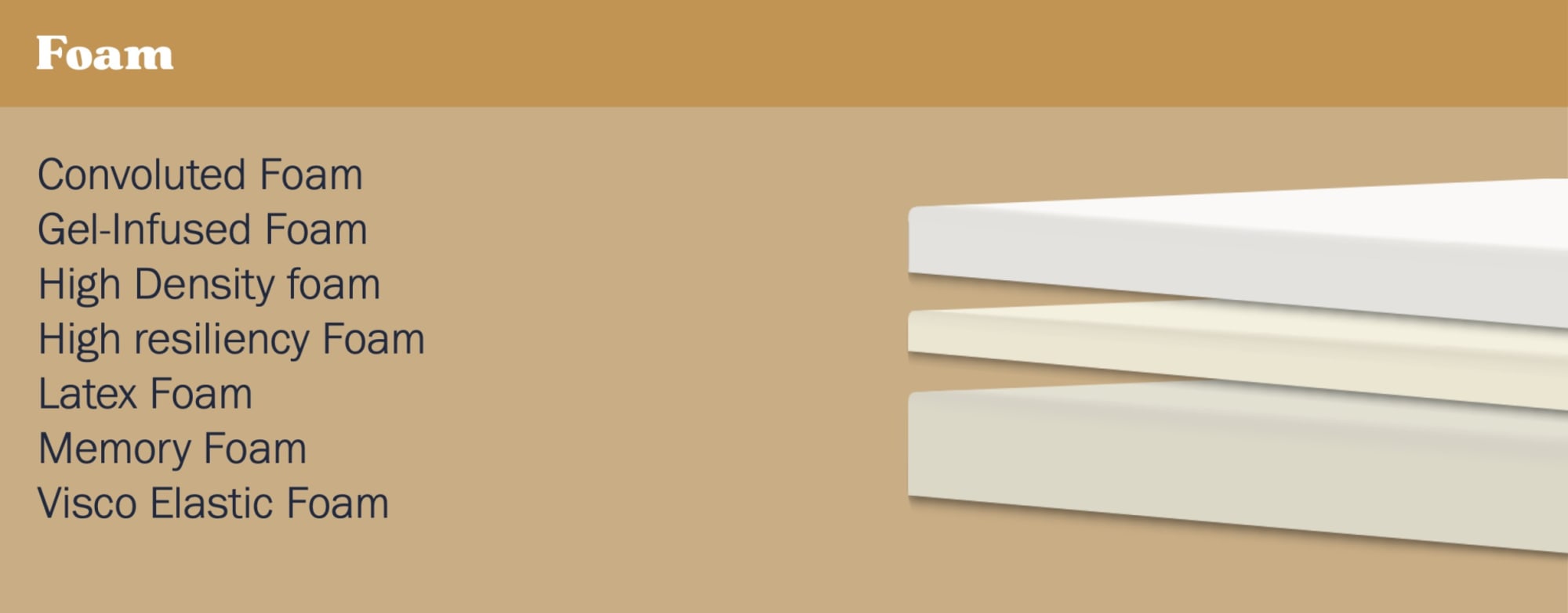Foam - Foam is a common material found in most mattresses which is prized for its combination of durability, comfort, and support. Mattress Foam is typically made from polyurethane or latex, and it can offer a variety of different comfort levels depending on its density.
