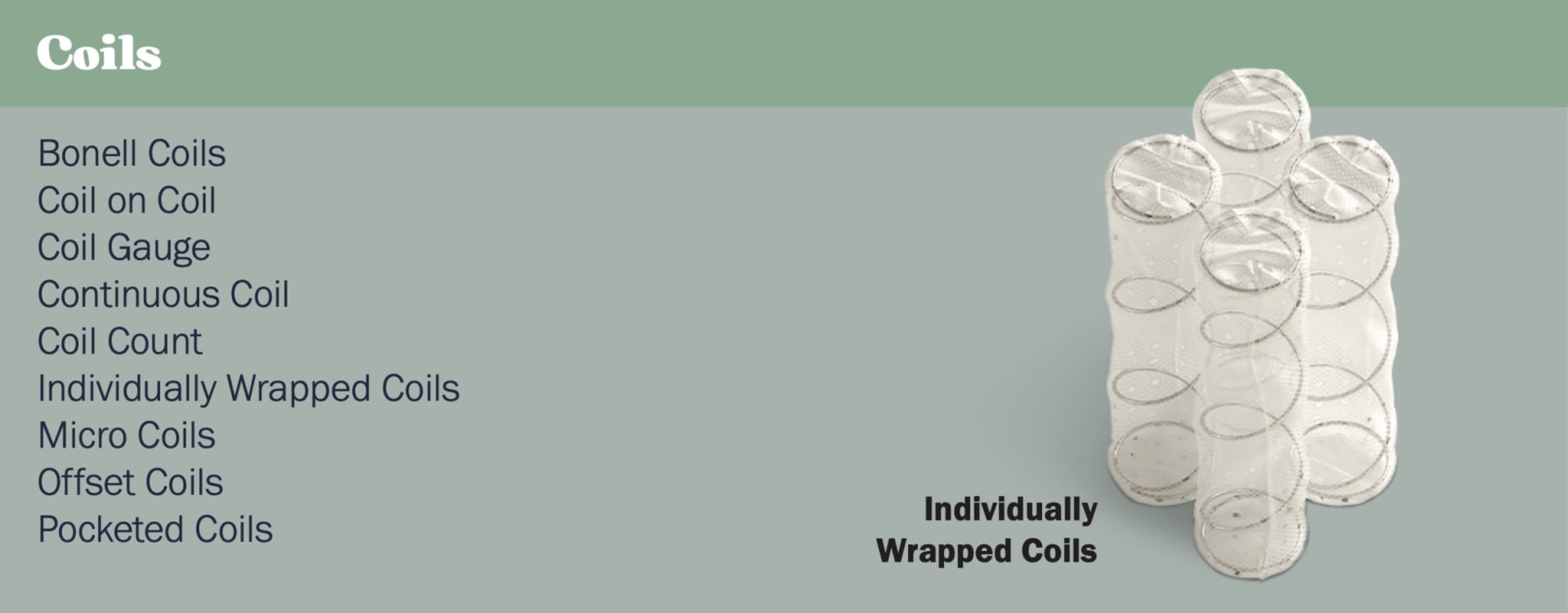 Individually-Wrapped Coils - Individually-Wrapped Coils are innerspring mattress coils which are placed inside their own individual fabric “pockets” rather than being connected to any of the other surrounding coils. This coil system offers superior motion separation as well as an enhanced ability to conform to the contours of the body compared to other innerspring coil systems because each coil is able to flex on its own rather than flexing as part of a conjoined unit.