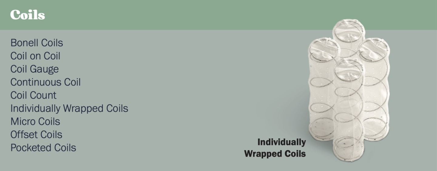 Coils - Coils are the supportive metal springs found in innerspring and hybrid mattresses. Designed to work together in a system, coils can come in a variety of shapes, sizes, and configurations.