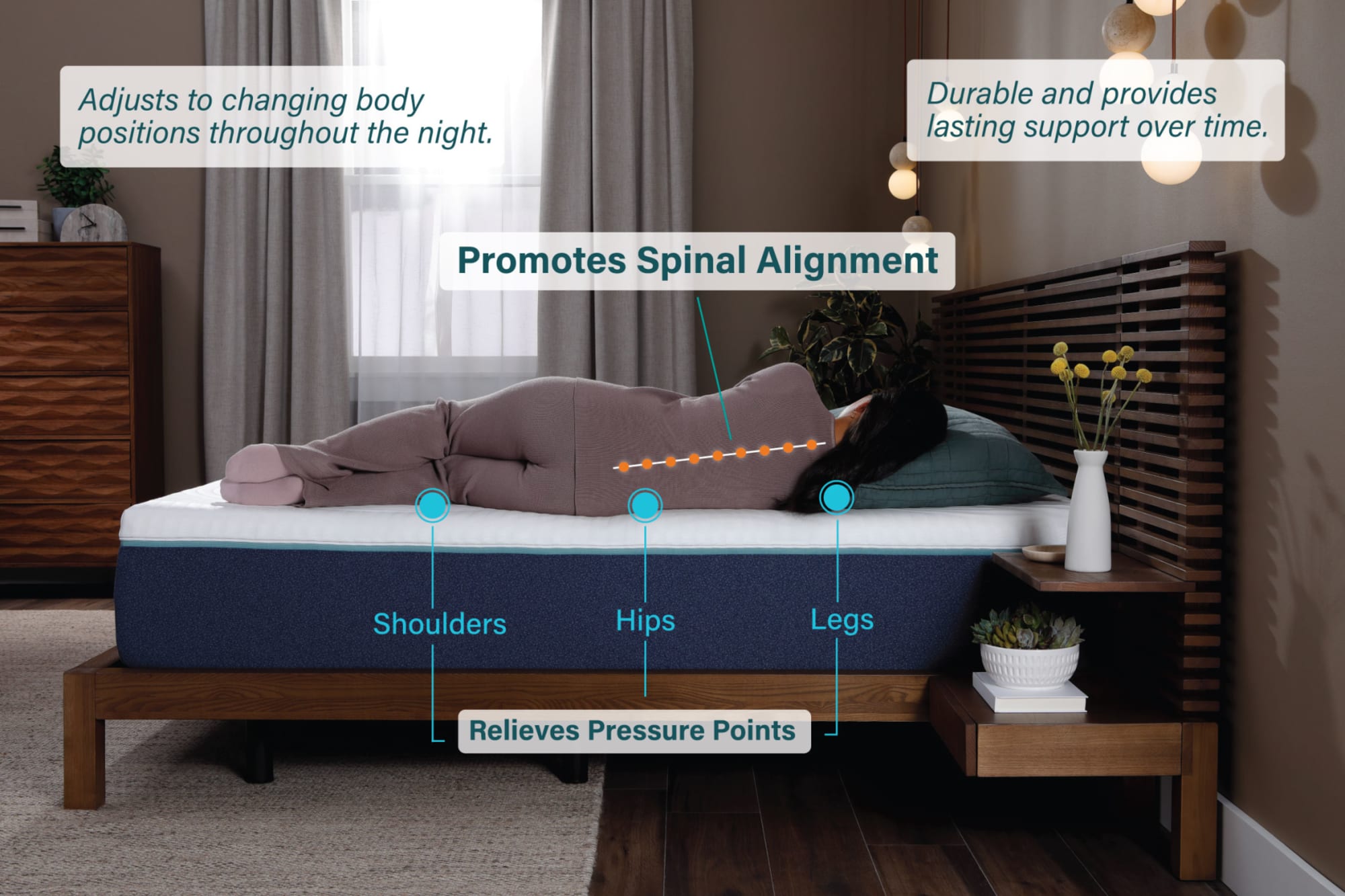 - Pressure relief around the shoulders and hips to reduce tossing and turning.